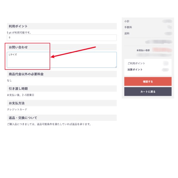 お支払い時、【確認する】ボタンを押す前に、「お問い合わせ」欄にサイズをご記入ください。(商品図4のように)